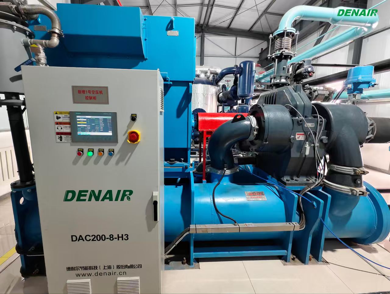 了解到客戶需求后我們德耐爾空壓機(jī)的工程師們第一時(shí)間去往客戶現(xiàn)場(chǎng)溝通,經(jīng)過多次數(shù)據(jù)監(jiān)測(cè),結(jié)合其工藝特點(diǎn)和產(chǎn)能規(guī)劃, 在現(xiàn)有輸灰空壓機(jī)房西側(cè)新建一座鋼結(jié)構(gòu)空壓機(jī)房,安裝一臺(tái)DAC200-8-H3的德耐爾離心式壓縮機(jī),置換原先其它品牌的6臺(tái)螺桿機(jī)。