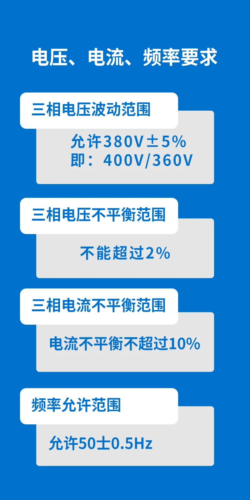 在我國,空壓機(jī)的電壓標(biāo)準(zhǔn)通常為380V或220V。其中,380V的電壓適用于大型空壓機(jī),而220V的電壓則適用于小型空壓機(jī),便攜式、移動式為主。但在超大型空壓機(jī)或電源等級較高的場所,有6KV、10KV高電壓電機(jī)驅(qū)動的空壓機(jī)。一般來說,電源電壓的波動需控制在額定電壓的±5%以內(nèi)。