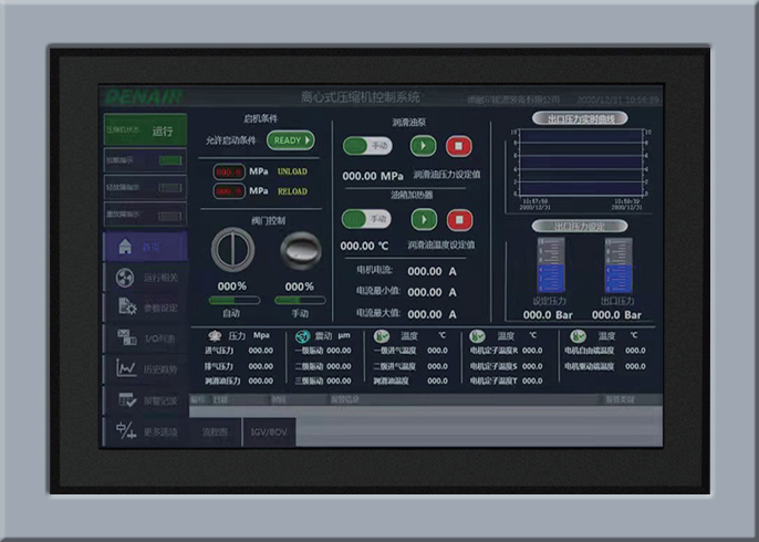 操作界面支持多種語(yǔ)言切換,顯示屏可以實(shí)時(shí)監(jiān)控機(jī)組內(nèi)所有參數(shù),將各級(jí)關(guān)鍵運(yùn)行參數(shù)實(shí)時(shí)以運(yùn)行曲線與數(shù)字的方式呈現(xiàn)。