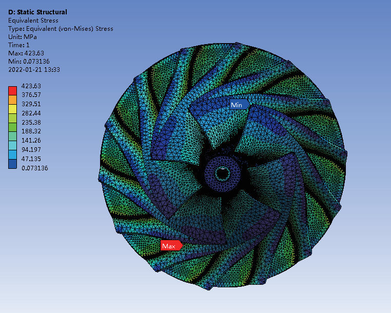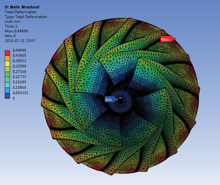 運(yùn)用有限元分析軟件,模擬葉輪在設(shè)計(jì)工況下的應(yīng)力和變形量情況。應(yīng)力分析結(jié)果為校核葉輪強(qiáng)度提供了科學(xué)的依據(jù),防止機(jī)組在實(shí)際運(yùn)行時(shí)因葉輪局部應(yīng)力集中、強(qiáng)度不夠釀成事故;計(jì)算的軸向、徑向變形量為葉輪與進(jìn)氣缸間隙的取值提供了參考,防止機(jī)組運(yùn)行時(shí)葉輪與進(jìn)氣缸發(fā)生相互刮擦,導(dǎo)致葉輪損毀等重大故障的發(fā)生。